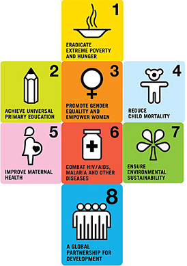 The Millennium Development Goals are outlined in eight respects, including eradication of poverty and hunger; universal elementary education; gender equity and women's autonomy; reduction of children's mortality; reduction of women's mortality; and the fight against the Human Immunodeficiency Virus (HIV), paludism (malaria) and other diseases.