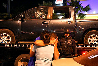 | | Family members of one of the slain state policemen console each other after seeing the pockmarked pickup the officers had been riding in when they were attacked in central Culiacan. The assailants, most likely cartel hitmen, escaped. At least 10 people died in 24 hours ending Wednesday night in Culiacan, in Sinaloa state, which has become a hub of violence since the federal government launched a crackdown against drug gangs. (Don Bartletti/Los Angeles Times) | | | Culiacan, Mexico — The fourth corpse pulled from the bullet-shattered pickup truck didn't have the benefit of a body bag. Only the face was covered (with a useless bulletproof vest). The victim's red shirt was even redder, soaked with blood. His bare arm hung limply from a gurney as he was lifted to a wagon from the morgue, the toes of his boots pointed skyward, at odd angles.