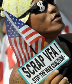 | | Man protests Visiting Forces Agreement in Philippines, which many citizens characterize as a primarily military, not humanitarian, effort. (AFP/Getty Images) | | | Survey respondents say military objectives prioritized over humanitarian ones.