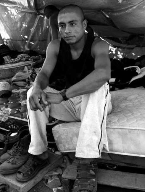 A Chatino farm worker from Oaxaca rests after work on the mattress where he sleeps. The workers in this camp have strung up blue tarps from the trees to provide shelter from sun and rain. They live next to a field of wine grapes. Though they seem to be living in some of the most difficult conditions imaginable, these communities have strong cultural bonds and create a support network that provides food and companionship for migrants just arriving from the south.