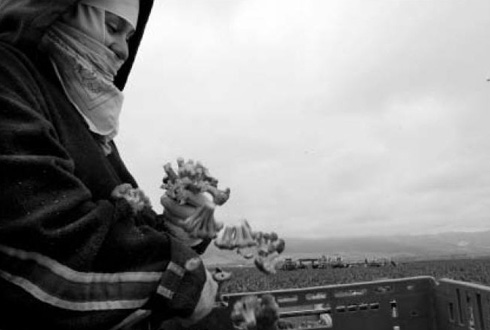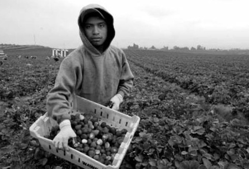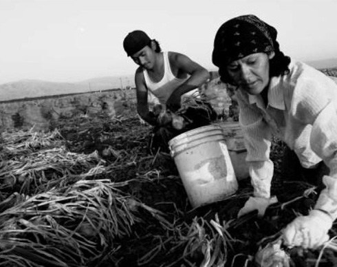 | | At sunset, at the southern-most end of the San Joaquin Valley, a crew of indigenous workers cut the tops and roots off bunches of onions. (David Bacon) |  | About 30 million Mexicans survive on less than 30 pesos per day - not quite $3. The minimum wage is 45 pesos per day. The Mexican federal government estimates that 37.7 percent of its 106 million citizens - 40 million people - live in poverty. Some 25 million, or 23.6 percent, live in extreme poverty. In rural Mexico, more than 10 million people have a daily income of less than 12 pesos - a little more than one American dollar.