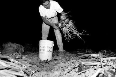 Horacio Torres tops onions late at night. Onion harvesters sometimes work at night in order to get as many hours of work as possible, and also because the heat is unbearable in the early afternoon. Workers are not paid overtime wages for this night work.