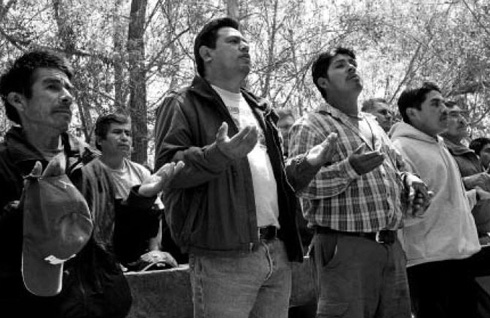 Every Sunday, a priest celebrates mass for migrant workers from Oaxaca in the ravine below the hill where they live in Del Mar. Migrants living here harvest tomatoes, strawberries, oranges and avocados, the county's principal crops. Until last year, they had camped under the trees on hillsides within sight of new housing developments. Their settlement was forcibly removed by county authorities after activists with the anti-immigrant Minuteman Project destroyed an altar built by the workers for the Catholic mass.