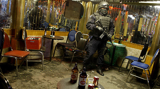 | | A federal policeman stands guard during an operation at a night club in downtown Ciudad Juarez. Mexico's bloodiest drug war city is Ciudad Juarez, across the border from El Paso, Texas. (Tomas Bravo/Reuters) |  | Juarez - The convenient and long-standing tradition south of the border is to blame Mexico's problems on the U.S. It can often be justified when the matter is the drug-trafficking violence now terrorizing much of Mexico, which is powered in large part by the insatiable gringo demand for drugs, the relentless flow of high-powered weapons from the U.S. and the just as chronic laundering of drug cash north of the border. As Washington hyperventilates over the threat of Mexico's narco-carnage spilling into the U.S., it can't ignore America's role in its neighbor's trafficking tragedy.