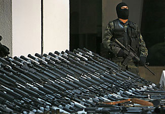 | | After a massive arms seizure of drug-cartel weapons last fall, a soldier stood guard over 288 assault rifles. The US says more than 90 percent of the guns seized in Mexico that can be traced originated in the US. (Gregory Bull/AP) |  | Most are, say US officials. But the NRA says the Obama administration is inflating the scope of the problem and threatens to undermine the Second Amendment.