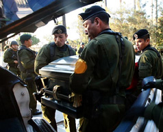 | | A Mexican army honor guard caries the body of a soldier killed in a shootout with drug suspects in Tijuana. (Don Bartletti/Los Angeles Times) |  | Petatlan, Mexico - President Felipe Calderón is rapidly escalating the Mexican army's role in the war against drug traffickers, deploying nearly 50 percent of its combat-ready troops along the U.S.-Mexico border and throughout the country, while retired army officers take command of local police forces and the military supplies civilian authorities with automatic weapons and grenades.