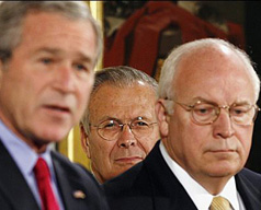 | | Former Secretary of Defense Donald Rumsfeld, center, and Dick Cheney look on as President Bush spoke before signing the Military Commissions Act of 2006. (Kevin Lamarque/Reuters) |  | Related: Jim Miles' review of the Torture Team – Deception, Cruelty and the Compromise of Law, by Philippe Sands