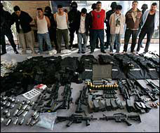 | | Men arrested by Mexican federal police stand behind weapons found in a home in Mexico City, Tuesday, Jan. 22, 2008. Eleven alleged hit men working for the Sinaloa drug cartel were captured at two Mexico City mansions stocked with grenades, automatic weapons and body armor. (Gregory Bull/AP) |  | George Grayson, professor of Comparative Politics (Latin America) and author of "Mexico's Struggle With 'Drugs and Thugs,'" was online Thursday, April 16, at 1 p.m. ET to discuss the drug problem and the administration's attempt to crack down on the narco-traffickers.