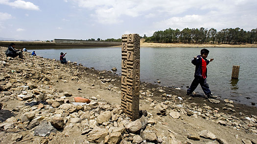 | | A child walks close to a measuring pile at the lake reservoir, in Villa Victoria, outside of Mexico City, on April 7, 2009. Authorities reported on Tuesday this will be one of the most serious water shortages in recent memory. (Luis Acosta/AFP) |  | Mexico City - The reek of unwashed toilets spilled into the street in the neighborhood of unpainted cinder block houses. Out on the main road, hundreds of residents banged plastic buckets and blocked the path of irate drivers while children scoured the surrounding area for government trucks. Finally, the impatient crowd launched into a high-pitched chant, repeating one word at fever pitch: "Water, Water, Water!"