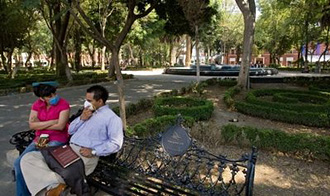 | | A couple wearing surgical masks sit on a bench at an empty park in Mexico City. (AFP/Omar Torres) |  | Mexico City – Mexico faces a "critical moment" in its handling of a deadly swine flu outbreak, the capital's mayor said Tuesday, as he ordered all eateries in the city closed to combat the virus's spread.