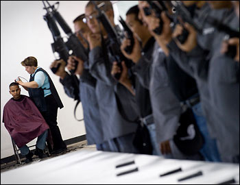 | | Cadets learn how to assemble and fire weapons at the Police Academy in the district of Cuauhtemoc. On the left, one cadet receives a very short haircut. (Sarah L. Voisin/Washington Post) |  | Ciudad Juarez, Mexico - A few months ago, the mayor of the most violent city in Mexico would sometimes sleep across the border in El Paso for safety. Now, with the military firmly in control of Ciudad Juarez, an entire day can pass without a single drug-related killing.
