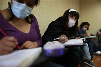 | | A college student, wearing a mask to protect against the swine flu contagion, looks up during a class at Mexico City's University of London, Thursday, May 7, 2009. High schools and universities closed by the epidemic, reopened across Mexico on Thursday as teachers and parents carefully checked returning students for flu symptoms. (AP/Brennan Linsley) |  | Mexico City Mexico's emergence from a national shutdown hit snags as some high schools were not cleaned in time to open and students returned to class in others without swine flu checkups. Cases of the virus popped up in two more Latin America countries.
