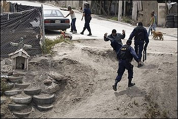 | | In this June 9, 2009 photo, state police officers detain suspects during an operation against street drug dealers in Tijuana, Mexico. Many of the 10,800 people killed since Mexican President Felipe Calderon began a crackdown on cartels in 2006 are small time drug dealers competing for their share of a booming number of Mexican drug consumers, a market that didn't exist a decade ago. (AP/Guillermo Arias) |  | Tijuana, Mexico - Drug dealer Hector Rodriguez Estrada had a feeling he was next.