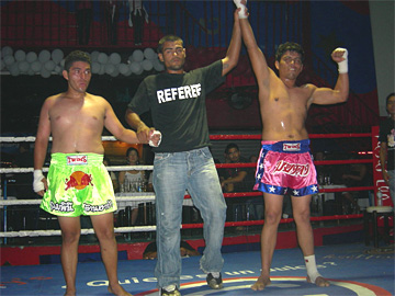 | | In the main event Jorge Lenin Lopez of Michoacan has his hand rasied in victory after defeating Puerto Vallarta's Eder "Thai" Huerta. Huerta was knocked down twice in the first round and broke two fingers in his Right hand, but was resiliant and made a fight of it. |
