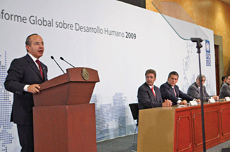 At Monday's speech, the governors of Morelos, Chiapas and San Luis Potosí, Marco Adame, Juan Sabines and Fernando Toranzo, respectively, accompanied the president, where he also spoke about the United Nations' 2009 Report on Human Development. The report places Mexico in a higher position than last year, ranking it as "high," with 0.854 points on a scale of 0 to 1.0.