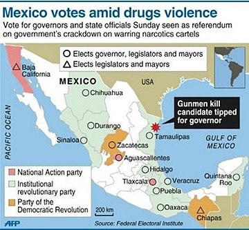 Four of the states that voted are on the border with the United States and have been the scene of pitched battles between drug cartels and Mexican government authories that have claimed thousands of lives.