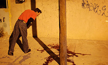| | A pavement stained with blood after an unidentified man was murdered in Ciudad Juarez, just another victim of Mexico's spiralling drug war. (Rodrigo Abd/AP) |  | Boom in demand for alarm systems and personal bodyguards with a 33% rise in security business on US border.