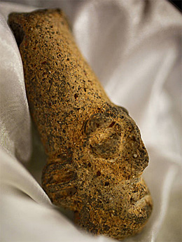 | | The artifact, found in a tourist's luggage, is 2 1/2 inches long and appears to have a face carved into the surface. (Michael Macor/SF Chronicle) |  | A small, pre-Columbian figurine that came rolled up in T-shirts in an airline passenger's luggage was returned to Mexico, its country of origin, on Tuesday.