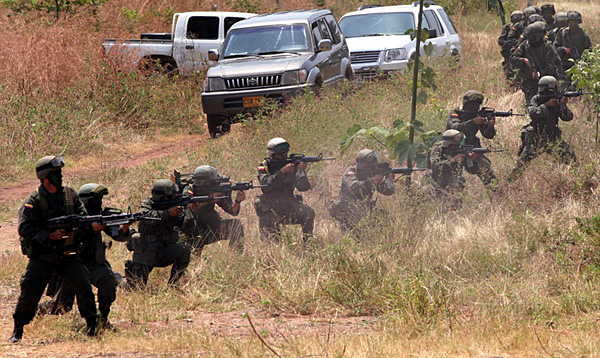Colombian forces have been battling a big guerrilla army with increasing success. It turns out that Colombia's expertise in counterinsurgency may help Mexican forces in their fight against the cartels. No Sleep Carlos Nieves, a gumshoe Mexican police investigator, stands in the dead of night, some 8,500 feet high in the mountains of central Colombia. His superior tells him — and more than 60 other cops and soldiers from across Latin America -– about the hardships ahead: hours and hours of hiking through thick brush, with temperatures near freezing. He is outfitted in olive-green camouflage and carries a 50-pound knapsack and an automatic rifle. Nieves says he hasn't slept in five days. That's been hard, he says, but it's been worth it. That's because after four months, Nieves and a handful of other Mexican police officers and soldiers are finishing the toughest of commando training courses. And not just from anyone: It's from Colombia's elite Jungla, or Jungle, unit. Part of the national police, it's sort of like a SWAT team, but one that targets the Revolutionary Armed Forces of Colombia. FARC, Colombia's biggest rebel group, some 9,000 fighters strong, holds territory, carries out ambushes and wields weapons of war — everything from AK-47s to antitank busters to 50-caliber machine guns. Nieves says that's the kind of weaponry he sees in raids in Mexico. Taking Fight To The Enemy There are many ways that Mexico is different from Colombia – most importantly there's no rebel army trying to overthrow the state. Yet, Mexico's violence is spiraling out of control, as it was in Colombia 20 years ago when Medellin cartel leader Pablo Escobar was at the height of his powers. There are other similarities, too: One is that the narcos in Mexico are increasingly starting to control territory and ambush Mexican forces. Colombian President Juan Manuel Santos told NPR that Colombia can provide training in intelligence gathering. It can also help to better prepare Mexican investigators and court officials for drug cases. "We don't want to sound like we know it all, because we are constantly learning, because these people are constantly adapting to new circumstances," he said. "But what we can do is work together in order to help in this very difficult situation that Mexico is going through." Exhaustive Syllabus Outside Cajica, what the Mexicans are learning is to take the fight to the enemy. At 5 a.m., gunfire signals a simulated assault on what's supposed to be a FARC camp. The trainees swoop into the FARC stronghold, but not everything is going as planned: The FARC commander, dubbed the Little Fat Man, is nowhere to be found. A Jungla commando overseeing the whole thing mocks the trainees, making sure they know they are failing at their main mission. Yet, in four months, the Mexicans have learned about explosives and assault rifles. They have done jungle training, learned how to raid heavily fortified houses and patrolled rivers. It will all come in handy, says Carlos Mejia, another police officer from Mexico. The training has been hard, but he says he feels better prepared for the violence he expects to face back home. At daylight, though they have been up for five days, the trainees are marching again, complete with a rousing song about the competence of Jungla commandos. They then shed their heavy packs and begin to crawl up a steep hill in the mud. With that, it's all over. It ends with the Jungla oath and graduation from commando training.