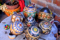 Traveling with me is friend and Ajijic artist Jesús López Vega, who has an abiding interest in native artisans and is a welcome bridge over the gaps in my Spanish. Our directions fail us just a few blocks short of our destination, but we park along the principal plaza opposite the church and graveyard and strangers direct us to a home walled in adobe brick; Martín is clearly also a local celebrity.