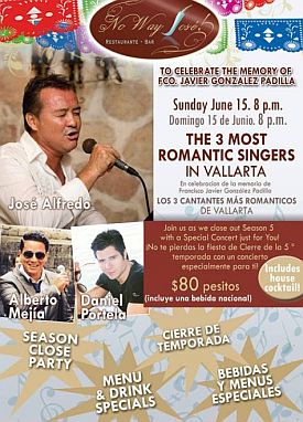 Celebrate Father's Day at Tu Casa en Vallarta, No Way José! What better way to show Dad you care than by treating him to a memorable night of dining and entertainment? Join owners Julie Guerrero and José Alfredo as they close their 5th successful year of business as one of Puerto Vallarta's finest restaurants with a very special concert by 3 of the most romantic singers in Puerto Vallarta - José Alfredo, Alberto Mejía and Daniel Portela. On Sunday, June 15 at 8 pm, they will be singing to honor the memory of Francisco Javier Gonzalez Padilla, and to celebrate everyone we love - both those who are still here and those who have gone before us - in a sentimental show that should not be missed. $80 pesos covers the entertainment portion of the evening, which includes one national drink, but you'll want to stick around and enjoy the restaurant's special "clean out the fridge" menu, as Tu Casa en Vallarta will also be saying "hasta la vista" til October 15.
