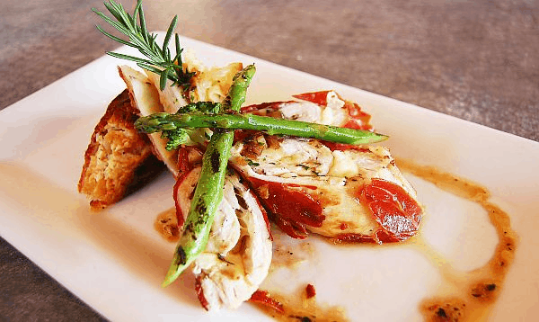 Chicken Saltimboca Roll, wrapped in Prosciutto with Gruyere Cheese and served with Asparagus and Scalloped Potatoes