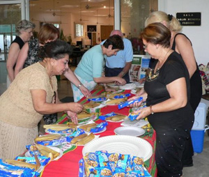 | | Member Margaret Tolton helps the scholarship girls fill the piñatas in the 2007 posada at Los Mangos Biblioteca. |